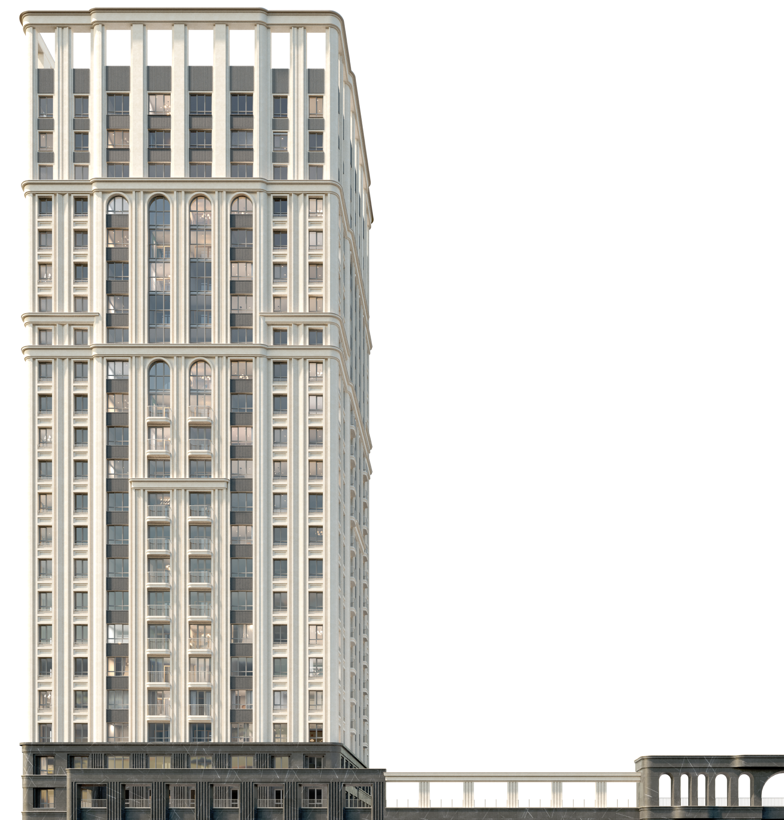 Фасады домов будут выполнены в стиле ар-деко, их дополнят строгие линии, филигранно сочетающиеся с плавными изгибами первых этажей.