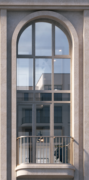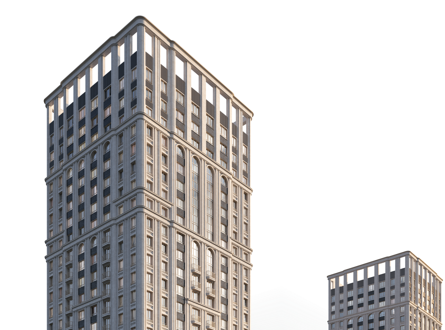 Фасады домов будут выполнены в стиле ар-деко, их дополнят строгие линии, филигранно сочетающиеся с плавными изгибами первых этажей. Экстерьер насыщен фризами, арками, колоннами, выступами и выразительным перфорированным поясом.